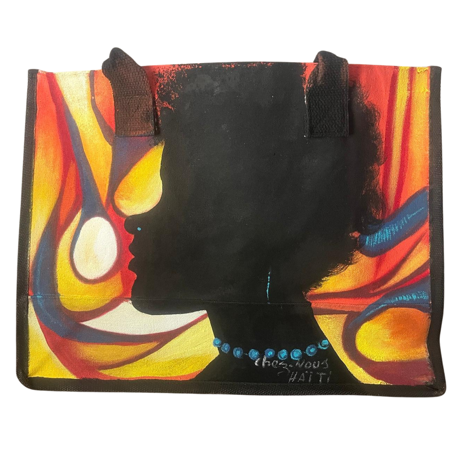 “Fanm Tènèb – Midnight Queen” is an original, one-of-a-kind Haitian hand-painted handbag that blends dramatic shadow with radiant color. The deep black profile, natural textured hair, and blue beaded necklace sit against a fiery palette of reds, yellows, and hints of cool blue—expressing both strength and softness in a single stroke.